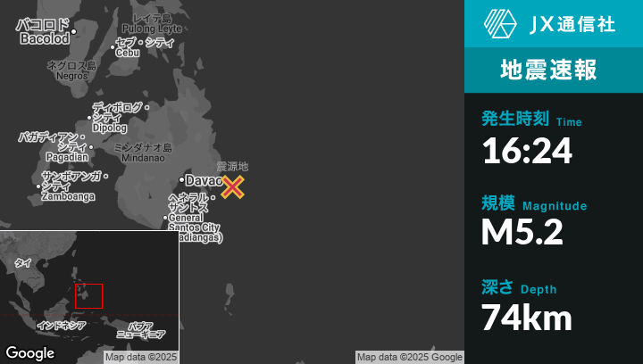 10月10日 16:24頃、フィリピンのManayから東南東41kmの地点でM5.2の地震がありました。