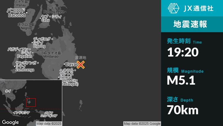 10月10日 19:20頃、フィリピンのManayから東南東25kmの地点でM5.1の地震がありました。