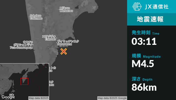 10月13日 03:11頃、ロシアのVilyuchinskから南東60kmの地点でM4.5の地震がありました。