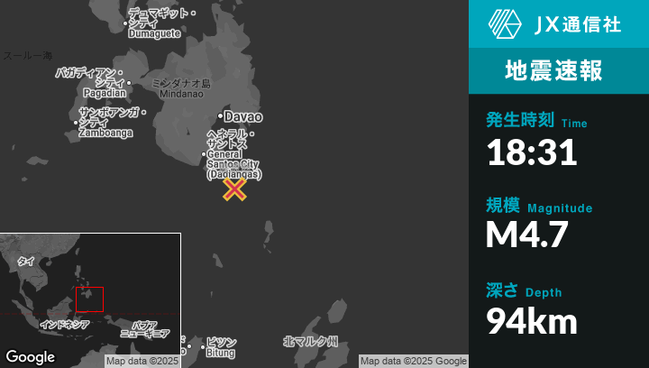 | 震源地 | フィリピンのSaranganiから東54kmの地点 |