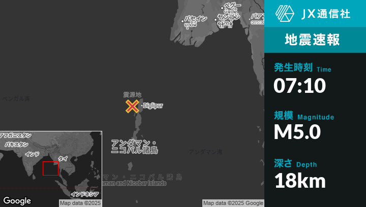 10月17日 07:10頃、インドのBamboo Flatから北183kmの地点でM5.0の地震がありました。
