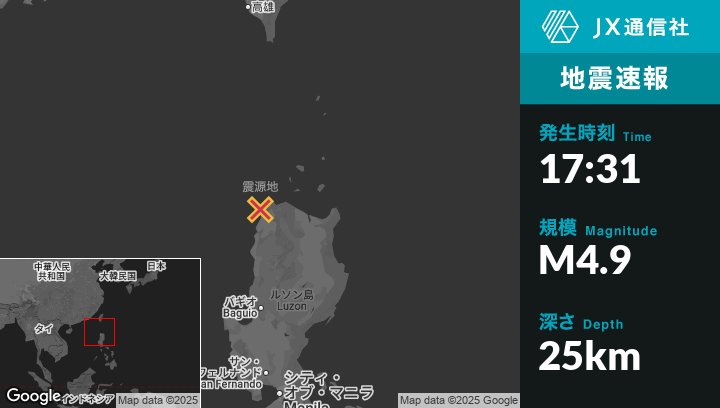 10月17日 17:31頃、フィリピンのDavilaから北12kmの地点でM4.9の地震がありました。