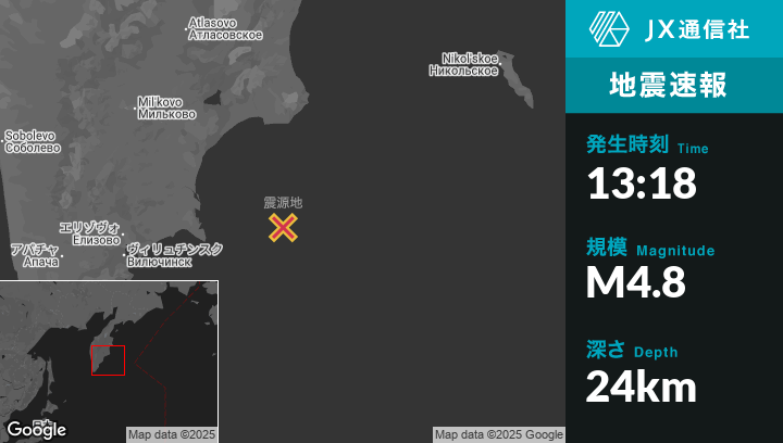 | 震源地 | ロシアのPetropavlovsk-Kamchatskyから東202kmの地点 |