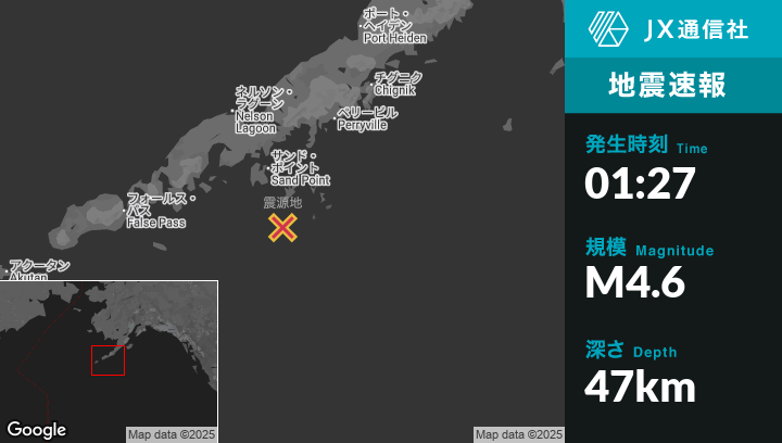 10月24日 01:27頃、アラスカのSand Pointから南南東70kmの地点でM4.6の地震がありました。