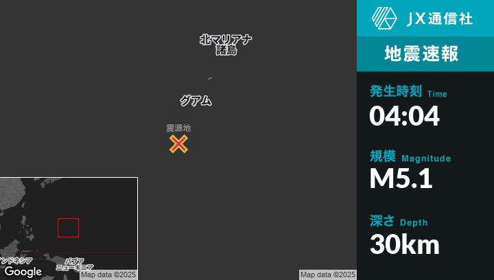 10月25日 04:04頃、グアムのMerizo Villageから南南西125kmの地点でM5.1の地震がありました。