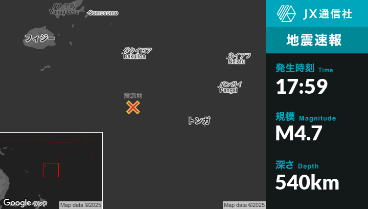10月25日 17:59頃、トンガのHoumaから西北西292kmの地点でM4.7の地震がありました。