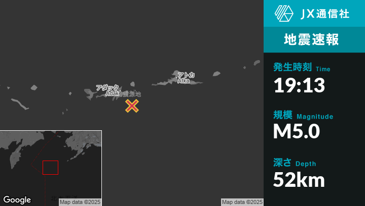 10月25日 19:13頃、アラスカのAdakから南東51kmの地点でM5.0の地震がありました。