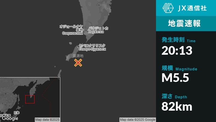 10月25日 20:13頃、ロシアのSevero-Kuril’skから南71kmの地点でM5.5の地震がありました。