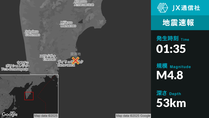 11月01日 01:35頃、ロシアのPetropavlovsk-Kamchatskyから東79kmの地点でM4.8の地震がありました。