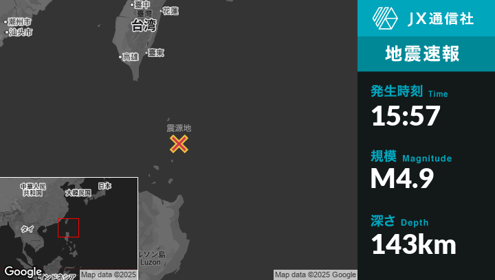 11月01日 15:57頃、フィリピンのBascoから南南東36kmの地点でM4.9の地震がありました。