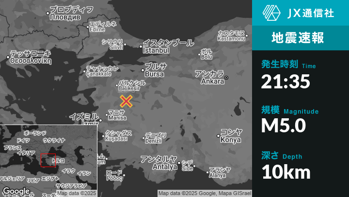 11月03日 21:35頃、トルコのSındırgıから東南東12kmの地点でM5.0の地震がありました。