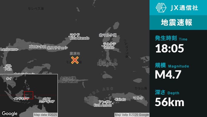 | 震源地 | インドネシアのModisiから南東118kmの地点 |