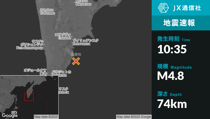 11月07日 10:35頃、ロシアのVilyuchinskから南南東91kmの地点でM4.8の地震がありました。
