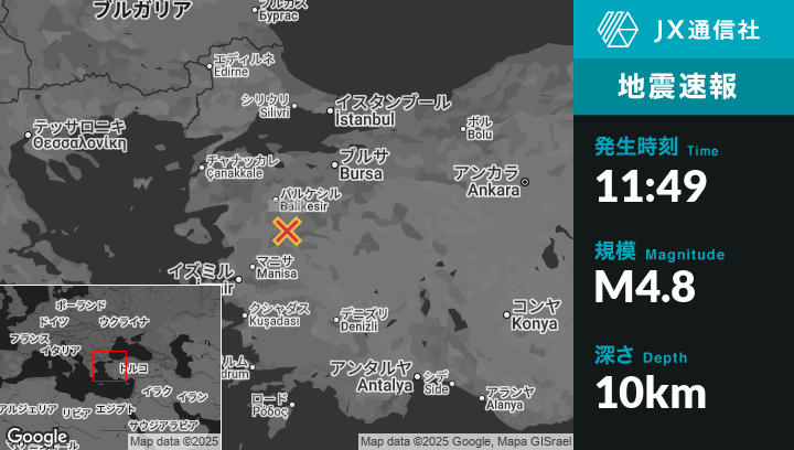 11月10日 11:49頃、トルコのSındırgıから西北西6kmの地点でM4.8の地震がありました。