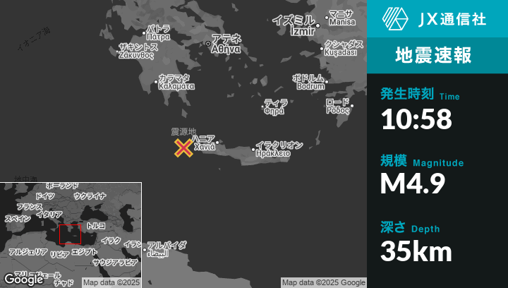 11月11日 10:58頃、ギリシャのKíssamosから西63kmの地点でM4.9の地震がありました。
