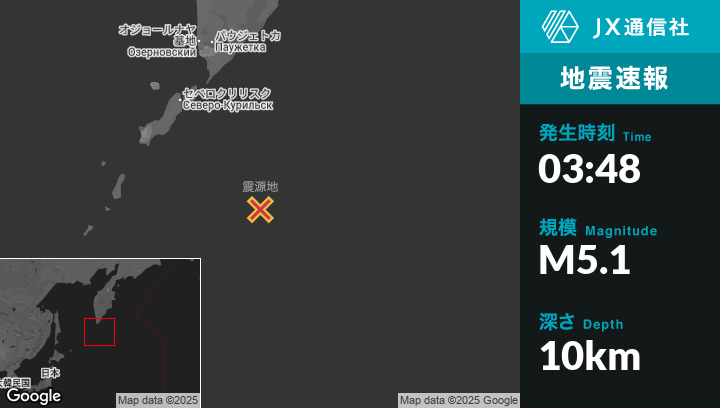 | 震源地 | ロシアのSevero-Kuril’skから南東207kmの地点 |
