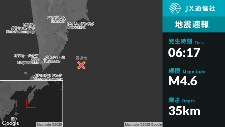 11月17日 06:17頃、ロシアのVilyuchinskから南南東197kmの地点でM4.6の地震がありました。