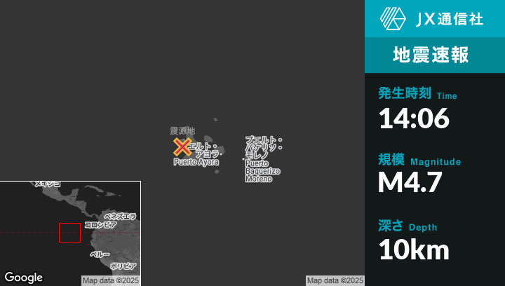 11月17日 14:06頃、エクアドルのPuerto Villamilから北西87kmの地点でM4.7の地震がありました。