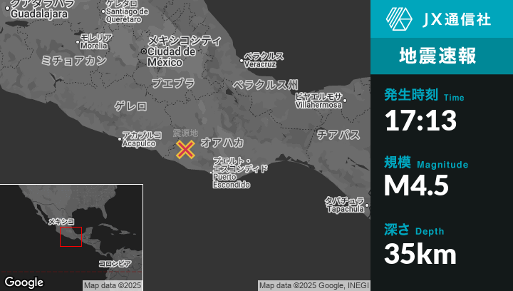 11月19日 17:13頃、メキシコのLa Reformaから北北西7kmの地点でM4.5の地震がありました。