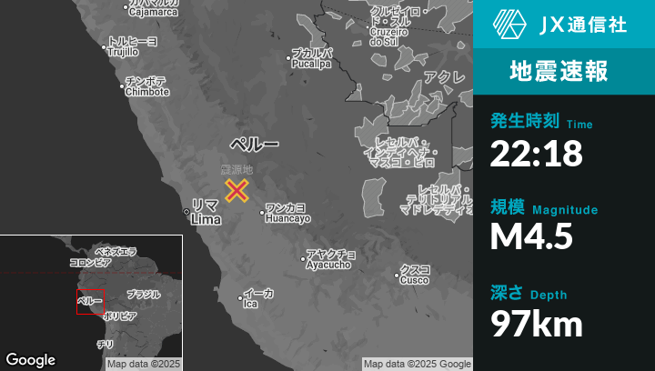 11月20日 22:18頃、ペルーのLa Oroyaから北東13kmの地点でM4.5の地震がありました。