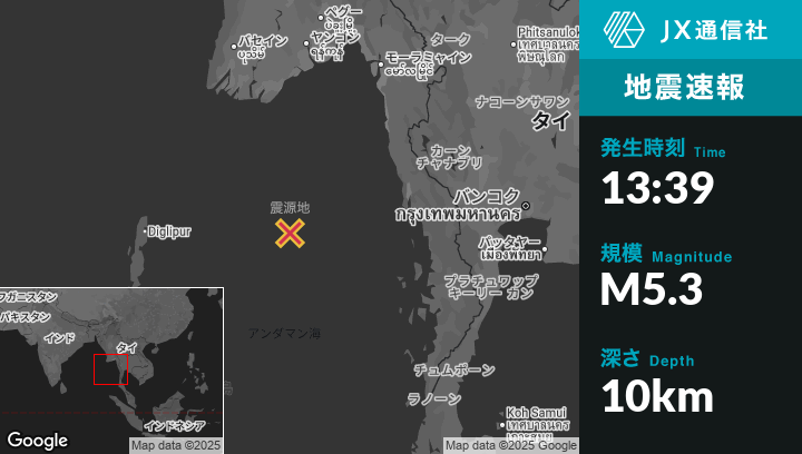 | 震源地 | ビルマ(ミャンマー)のDaweiから西南西267kmの地点 |