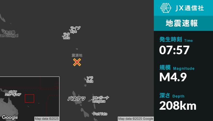 12月03日 07:57頃、バヌアツのSolaから北北西170kmの地点でM4.9の地震がありました。