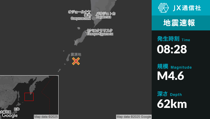 12月06日 08:28頃、ロシアのSevero-Kuril’skから南南西157kmの地点でM4.6の地震がありました。