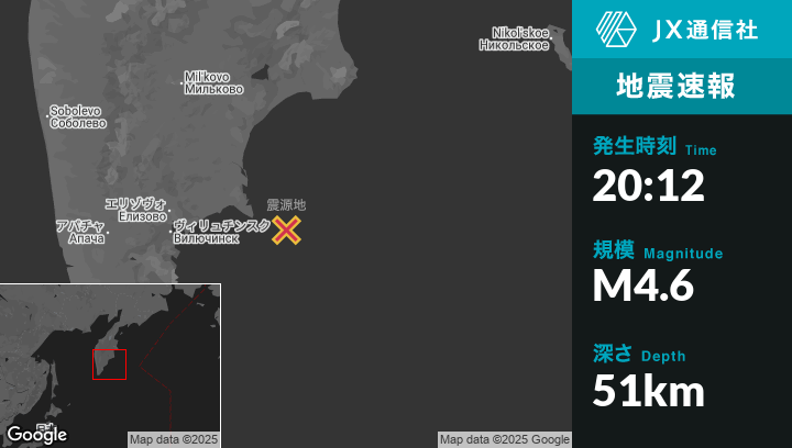 | 震源地 | ロシアのPetropavlovsk-Kamchatskyから東139kmの地点 |