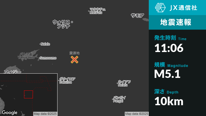12月07日 11:06頃、ウォリス・フツナのAloから南南東287kmの地点でM5.1の地震がありました。