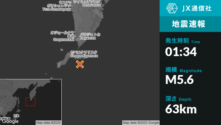 12月08日 01:34頃、ロシアのSevero-Kuril’skから南東67kmの地点でM5.6の地震がありました。
