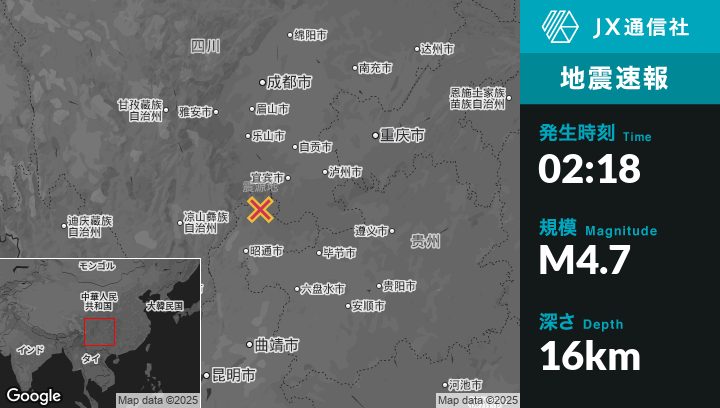 12月12日 02:18頃、中国のShuanglongから南西39kmの地点でM4.7の地震がありました。