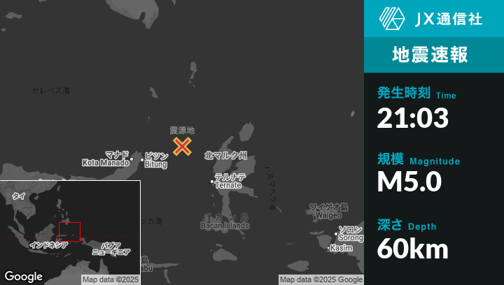 | 震源地 | インドネシアのBitungから東北東158kmの地点 |