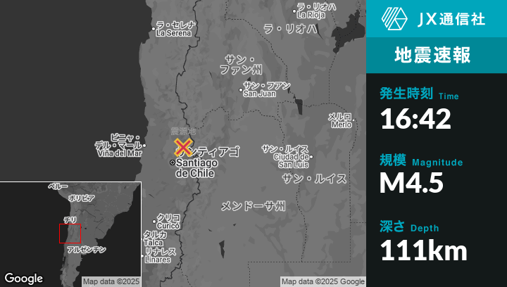 12月16日 16:42頃、チリのLos Andesから東南東28kmの地点でM4.5の地震がありました。