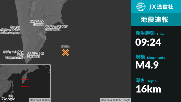 12月20日 09:24頃、ロシアのVilyuchinskから南東184kmの地点でM4.9の地震がありました。