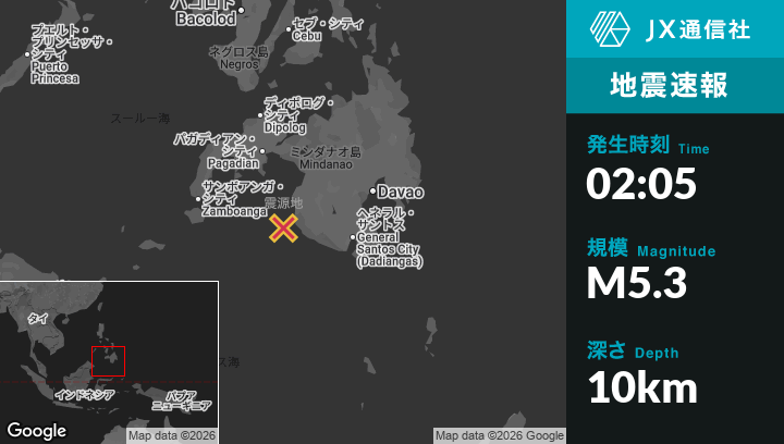 1月28日 02:05頃、フィリピンのSangayから西27kmの地点でM5.3の地震がありました。