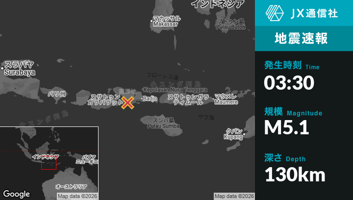 | 震源地 | インドネシアのDompuから南西17kmの地点 |