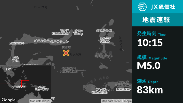 | 震源地 | インドネシアのModisiから南75kmの地点 |