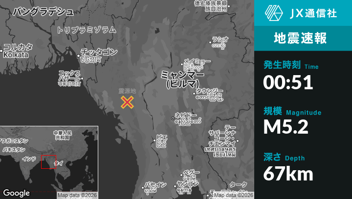 2月04日 00:51頃、ビルマ(ミャンマー)のYenangyaungから西88kmの地点でM5.2の地震がありました。