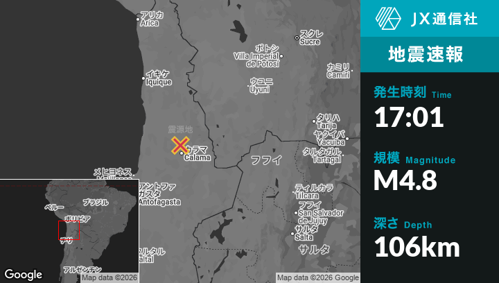 2月04日 17:01頃、チリのCalamaから北38kmの地点でM4.8の地震がありました。
