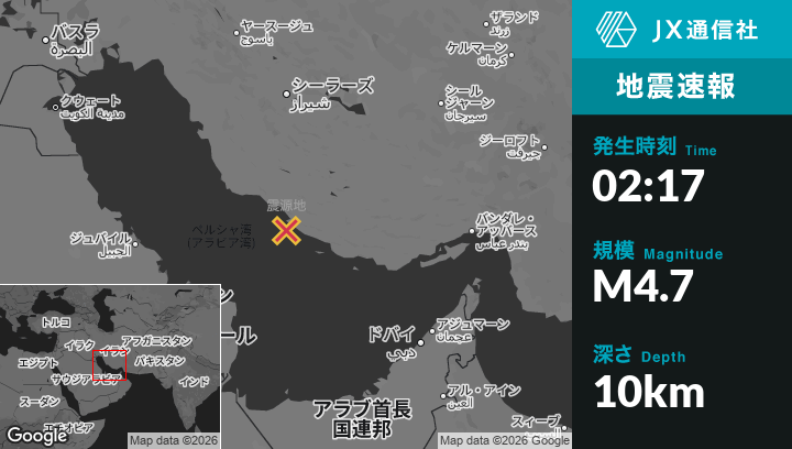 2月05日 02:17頃、イランのMohrから南西39kmの地点でM4.7の地震がありました。
