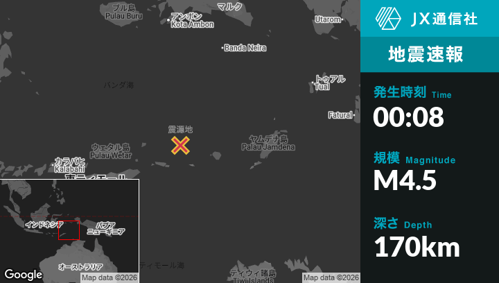 2月06日 00:08頃、東ティモールのLospalosから東北東208kmの地点でM4.5の地震がありました。