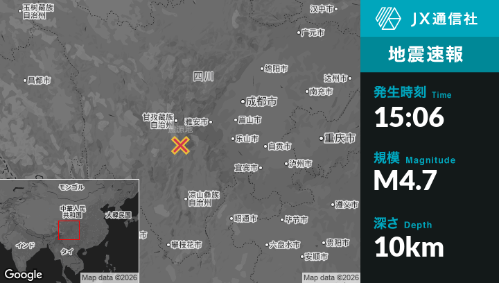 2月08日 15:06頃、中国のKangdingから南南東58kmの地点でM4.7の地震がありました。