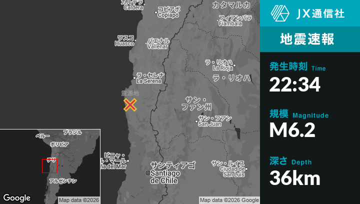2月12日 22:34頃、チリのOvalleから南西32kmの地点でM6.2の地震がありました。
