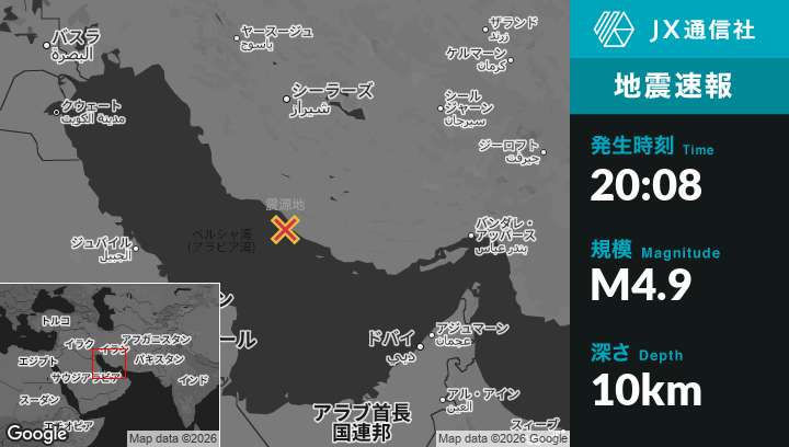 2月13日 20:08頃、イランのMohrから西南西34kmの地点でM4.9の地震がありました。