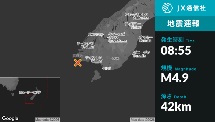 | 震源地 | ニュージーランドのRivertonから西118kmの地点 |