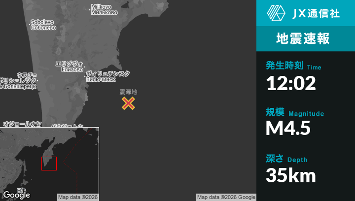 | 震源地 | ロシアのPetropavlovsk-Kamchatskyから南東144kmの地点 |