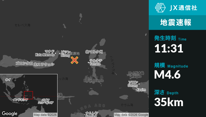 | 震源地 | インドネシアのTernateから西北西126kmの地点 |