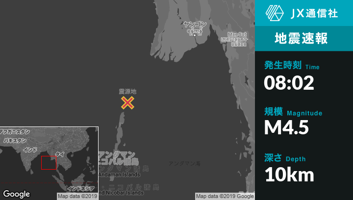 4月14日 08:02頃、インドのBamboo Flatから北266kmの地点でM4.5の地震がありました。