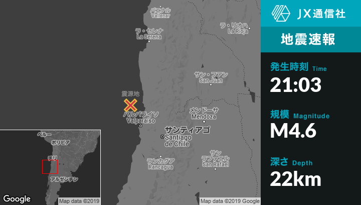 4月28日 21:03頃、チリのLa Liguaから西北西84kmの地点でM4.6の地震がありました。
