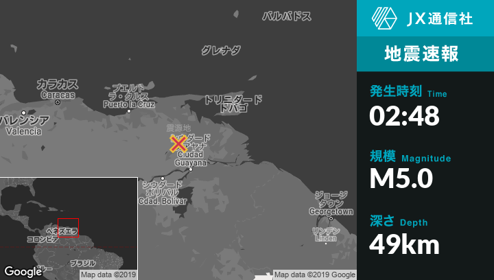4月29日 02:48頃、ベネズエラのMaturinから南南東51kmの地点でM5.0の地震がありました。
